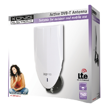 Antena TDT para interior/exterior con filtro LTE para la recepción de televisión digital terrestre y señales de radio. Esta antena tiene carcasa y conector resistentes al agua y un recubrimiento anti-UV. Todos los materiales de montaje están incluidos. La antena se alimenta con el receptor TDT (5V, 50 mA) o mediante un adaptador incluido.
