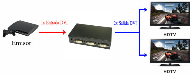 1: Distribuye la señal grafica DVI de un ordenador a 2 monitores simultáneamente .