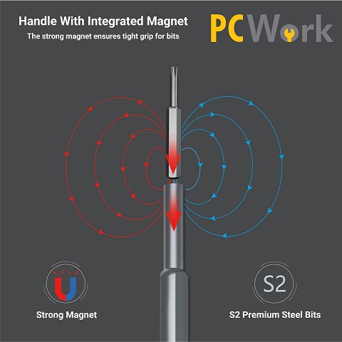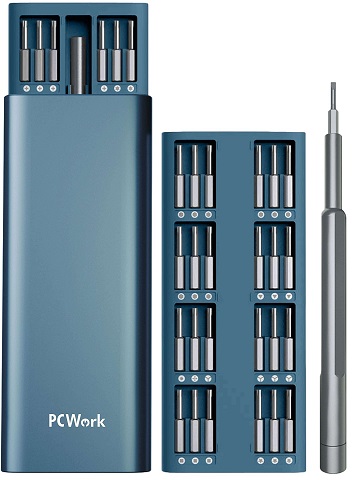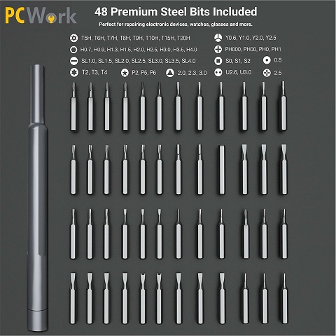 El juego de destornilladores de precisión PCW08B 48 en 1 contiene 48 puntas diferentes hechas de acero S2 de alta calidad que se pueden usar para reparaciones de alta precisión en teléfonos inteligentes, tabletas, anteojos, relojes y otros dispositivos con tornillos pequeños. Un factor distintivo del juego es el mango ergonómico de aluminio que ofrece un excelente agarre y tiene un imán integrado para mantener las puntas firmemente en su lugar, lo que permite un trabajo de precisión. Mientras las puntas no están en uso, el imán integrado en el estuche las sujeta y evita que se caigan. El estuche tiene un hermoso diseño y un acabado azul mate, lo que subraya el aspecto y la sensación de primera calidad del juego de peaje. Debido a sus materiales de alta calidad y su atractivo diseño, el PCW08A es un regalo perfecto para cualquier aficionado o usuario profesional y es imprescindible para cualquier hogar.