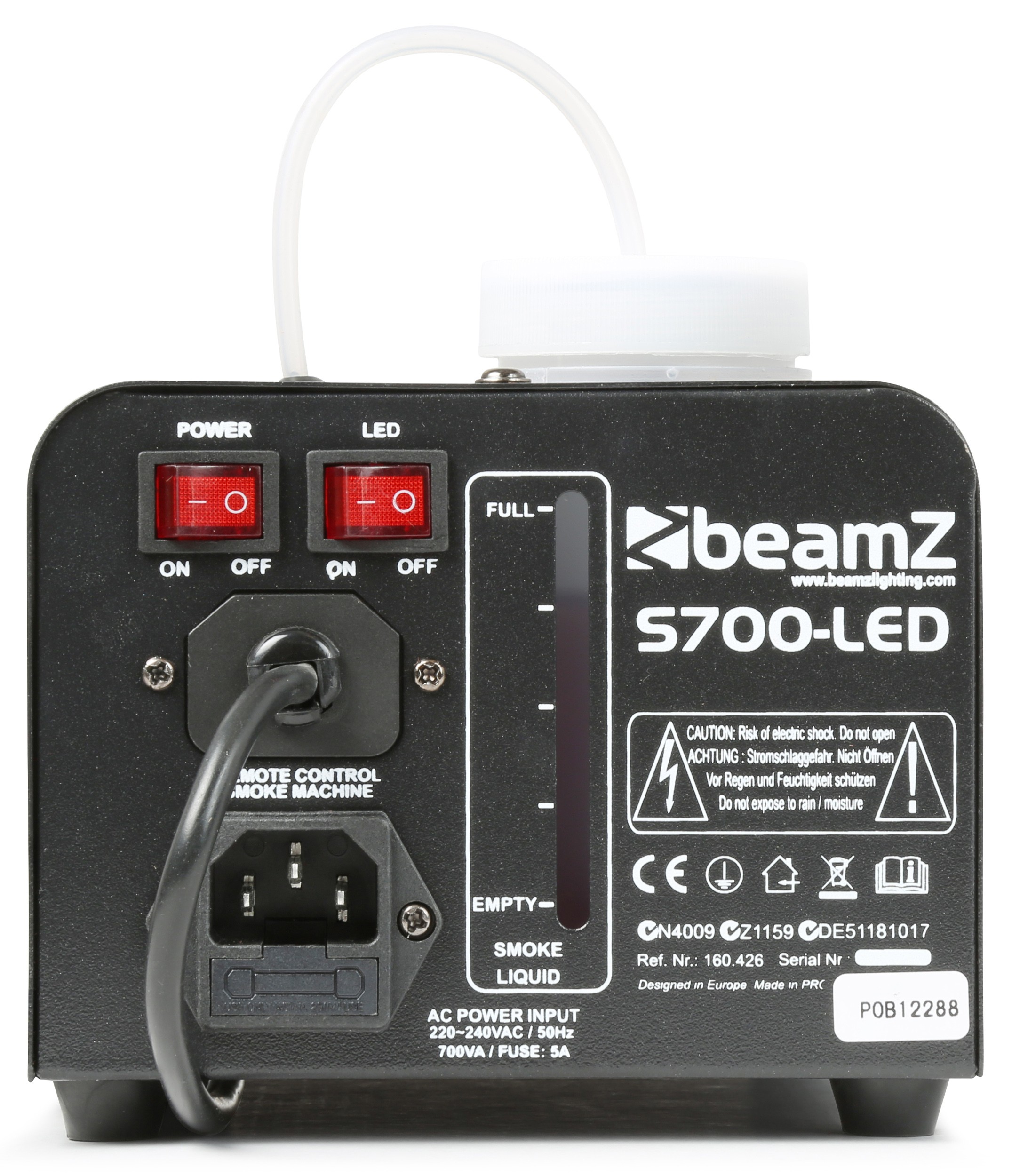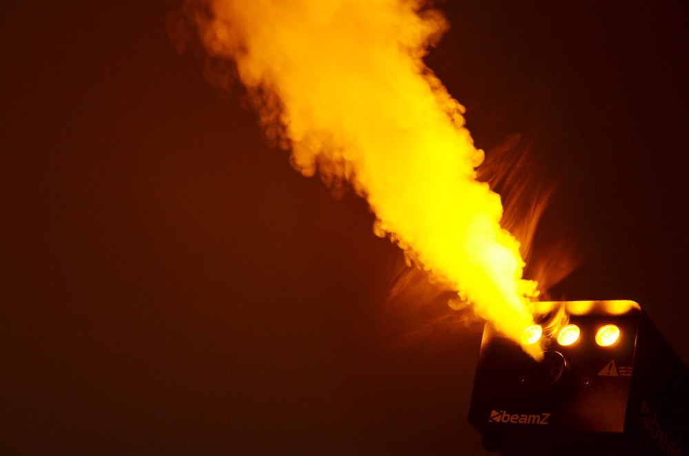 Maquina de humo compacta de 700W con leds ambar que producen un efecto llamas al producir el humo. La unidad incorpora un alojamiento para el tanque de liquido. El efecto llamas puede desconectarse por un interruptor en la parte trasera. El humo puede lanzarse desde el control de mando a distancia por cable.