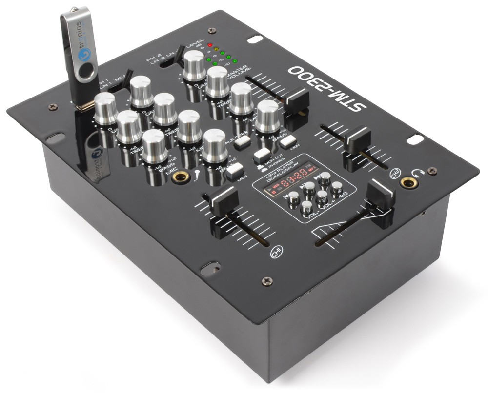 El STM-2300 es un mezclador con puerto USB que permite reproducir directamente las canciones en MP3 desde un stick USB. Con 2 entradas seleccionables linea/phono y salidas para master y monitor. Cada canal incorpora 3 bandas de EQ consiguiendo una calidad sonora increible en esta gama de mezcladores. El canal de micro incluye volumen independiente y 2 bandas de EQ. Asignacion para auriculares y monitor y crossfader. Un mezclador muy interesante para cualquier uso.