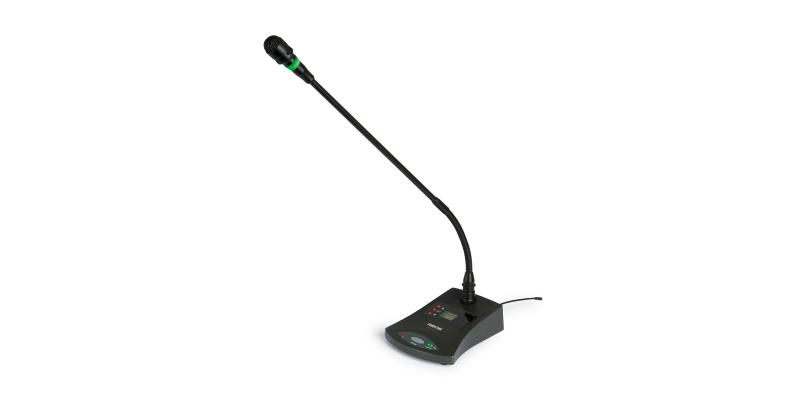 Micrófono inalámbrico de sobremesa con cápsula de condensador electret unidireccional y transmisor UHF para repuesto o ampliación.