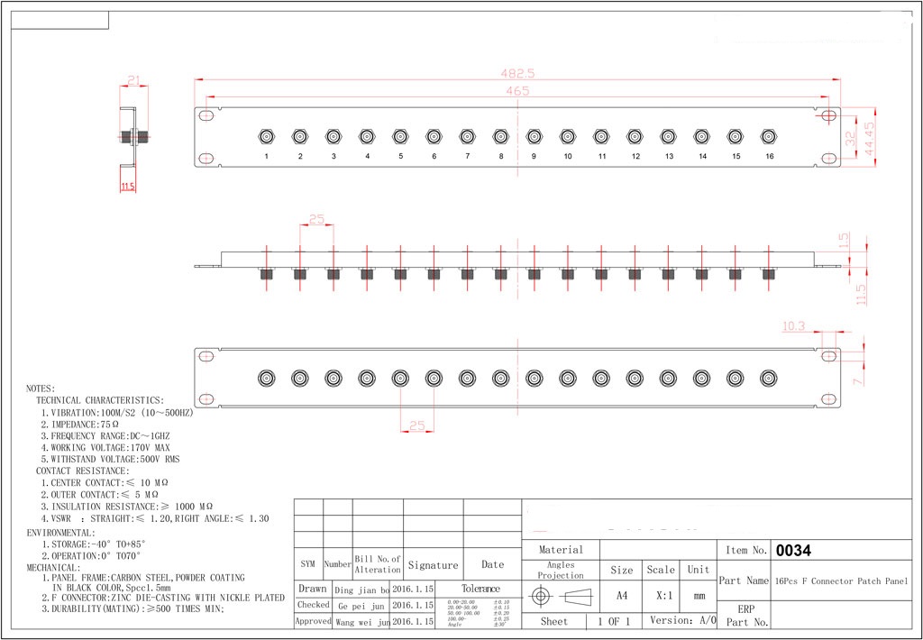 – Patch panel para rack de 16 puertos, con connectores tipo F