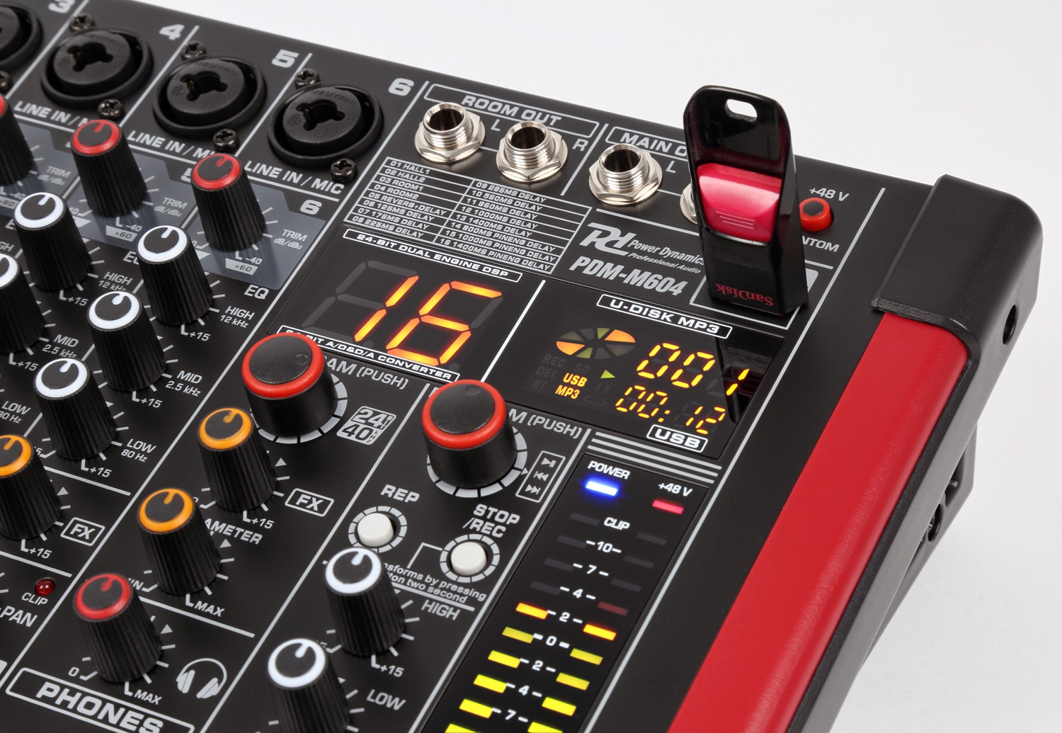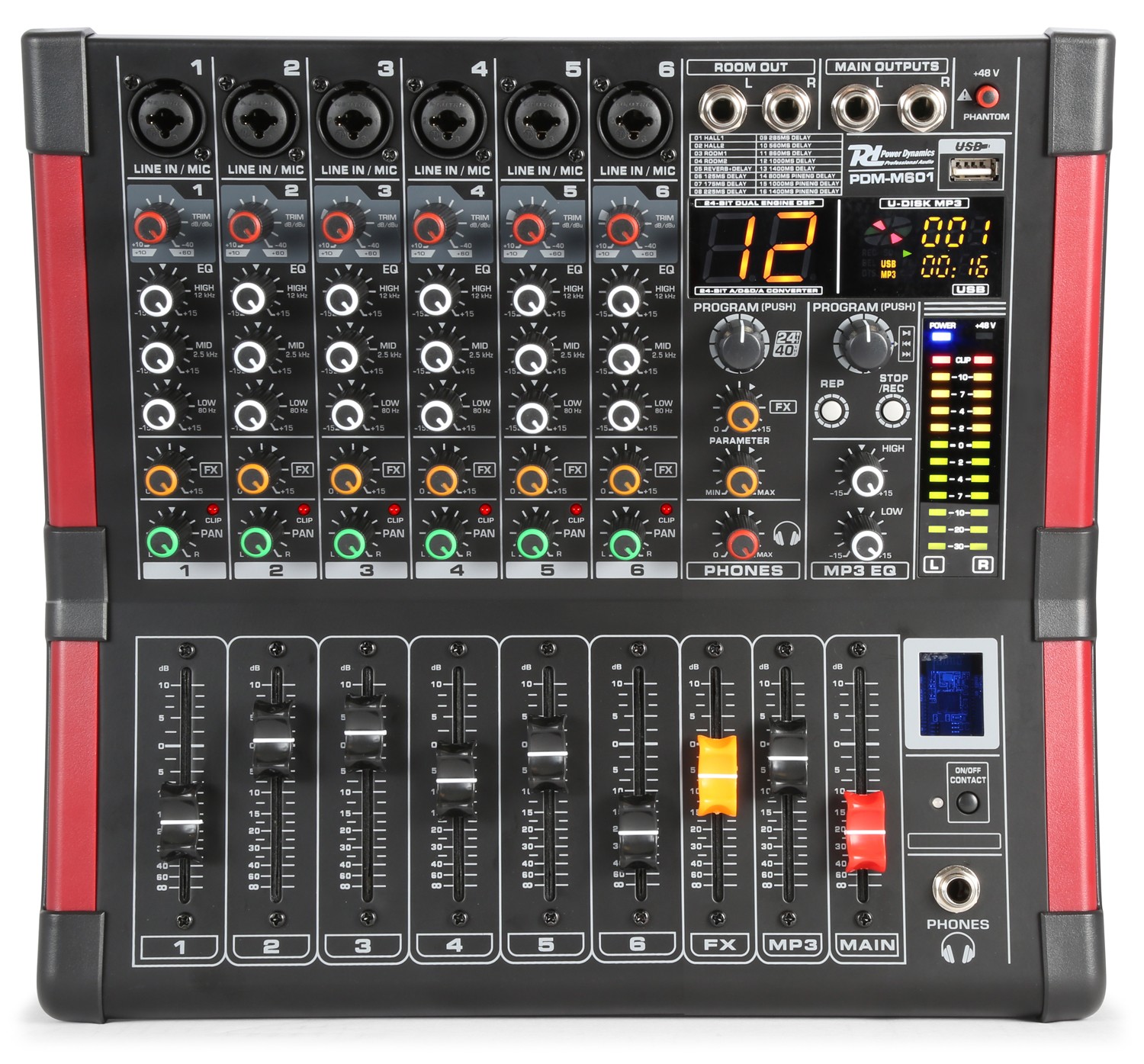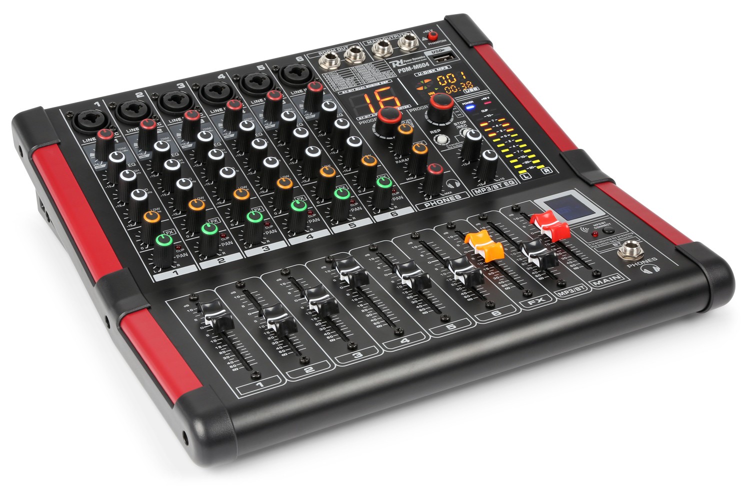 Completo mezclador con 6 canales. Incluye receptor BT y procesador multi efectos FX de 24 bits con 16 presets. Ideal para estudios medianos y funciones de grabacion.
