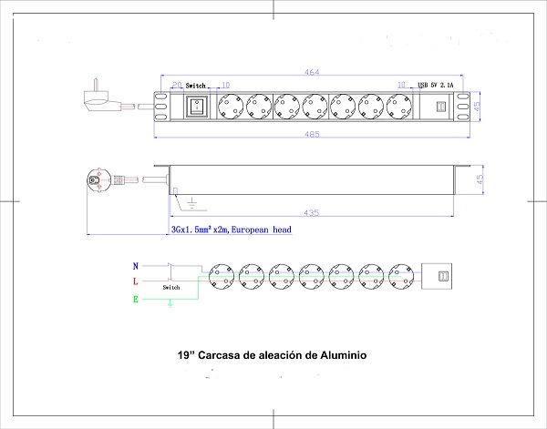 Regleta de 7 enchufes + 2 USB A para rack 19″