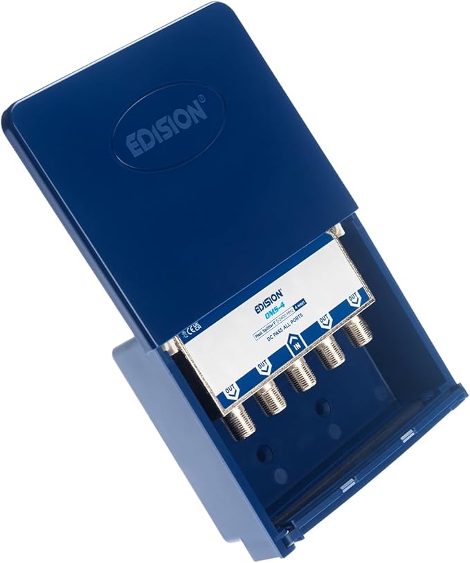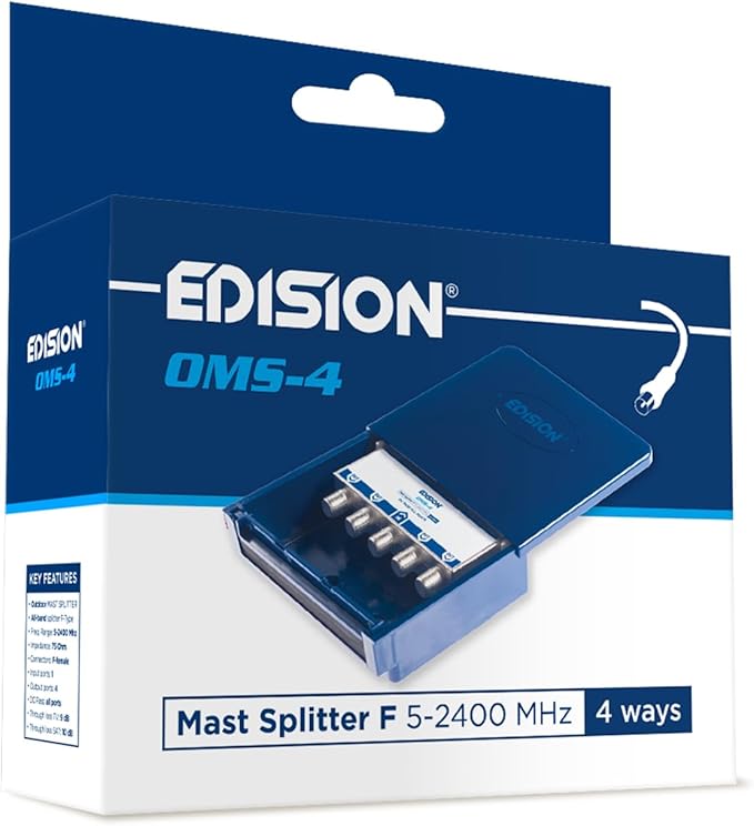 Repartidor Antena TV de Mástil 4 Salidas Exterior, adecuado para Terrestre, Satélite, Televisión por cable, Radio, Unicable Margen de frecuencia 5-2400Mhz, ALL BAND Splitter, Carcasa sólida hecho de zinc Entrada RF: 1 | Salidas RF: 4 Pérdidas de paso: TV 9dB / SAT 10dB Con conectores F, Paso DC en todas las salidas + Caja Estanca Exterior