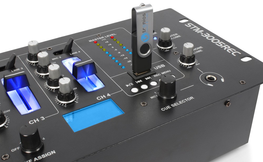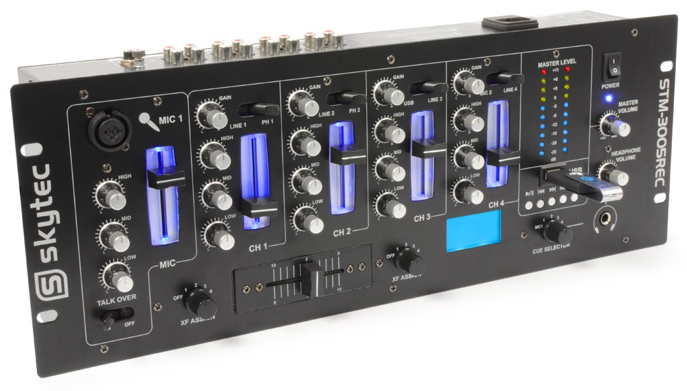 Mezclador de 4 canales con reproductor MP3 y grabadora a traves de USB, con faders iluminados y crossfader asignable. Para mejorar la audicion incorpora Cue en cada canal, 3 bandas de EQ para microfono y Master. Permite grabar la mezcla en formato WAV para reproducirlas mas tarde en cualquier reproductor.