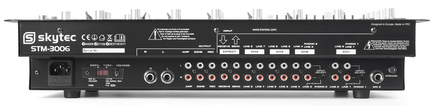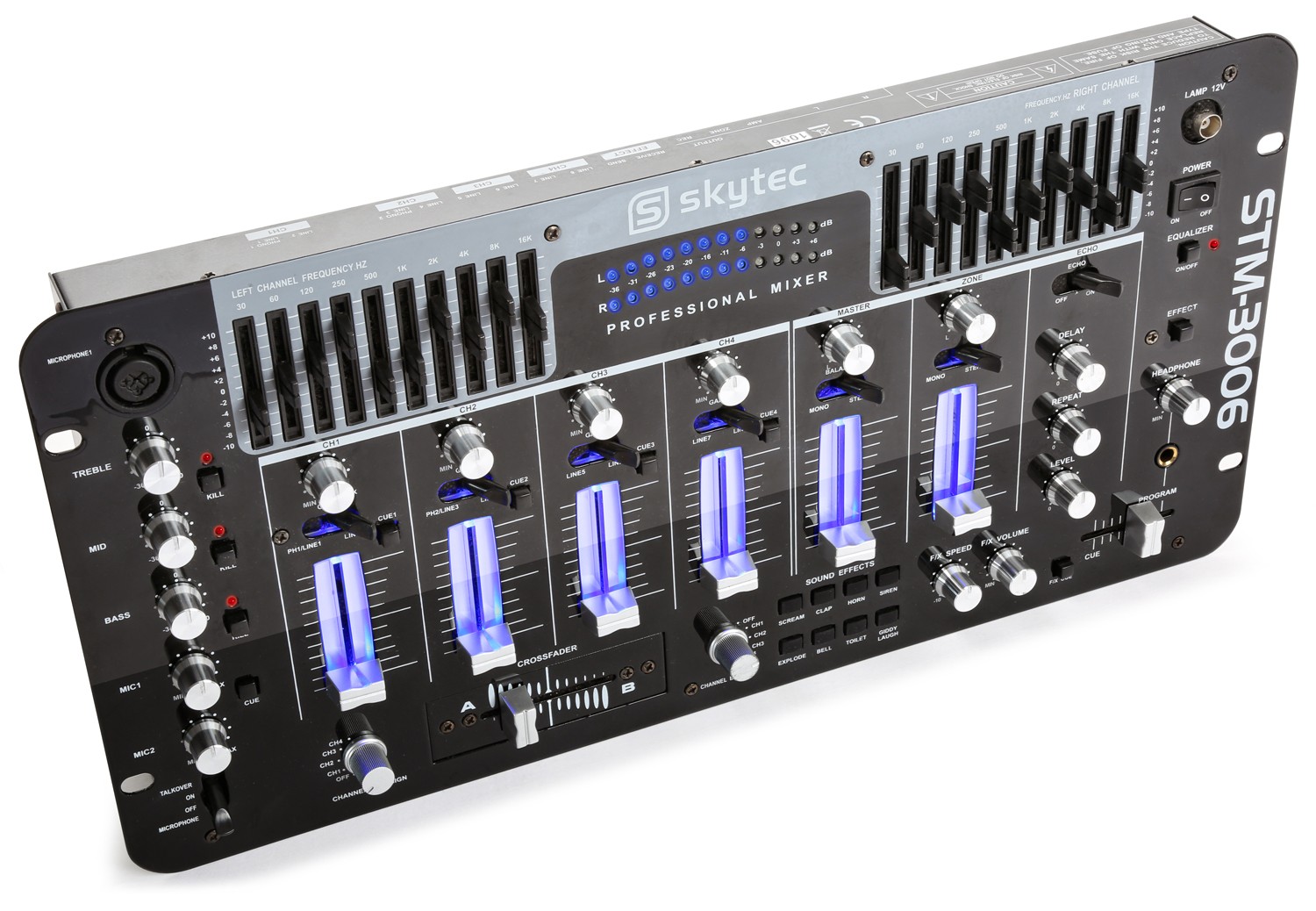 Mezclador versatil 6-canales enracable 19″ profesional con canales de fader iluminados, 10-Bandas grafico EQ, microfono con ecualizador y talkover, Efectos de sonido, auriculares en cada canal para monitorizar y muchas otras caracteristicas. Ideal para disco, club, bar, y home studio etc.